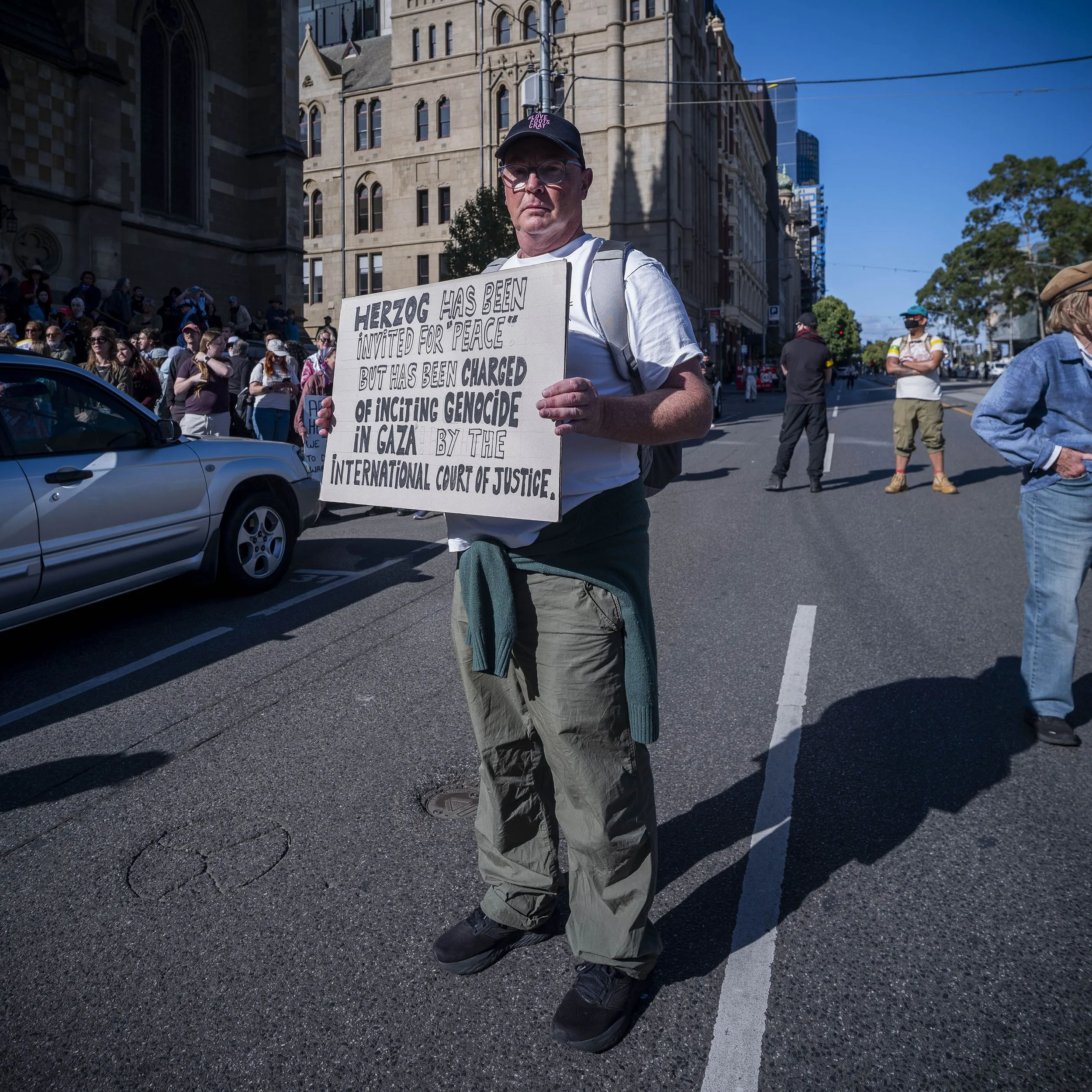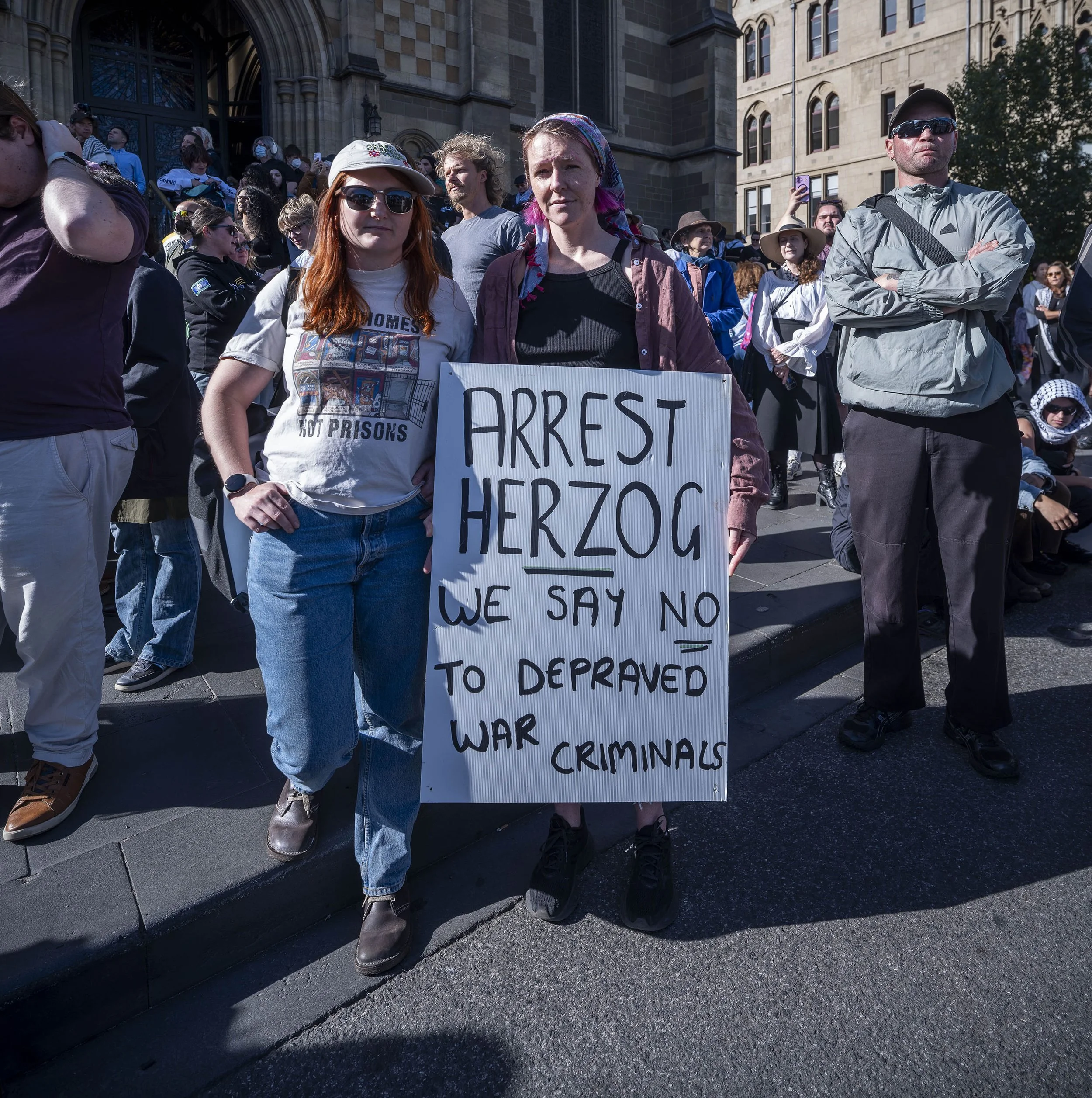 ‘ I'm here to protest against Herzog. He's a war criminal, and the Australian government is sending a very clear message to us that they're okay with what's going on in Gaza. I'm all for social cohesion, but not when it's aiding and abetting people like Herzog and the systems he represents.