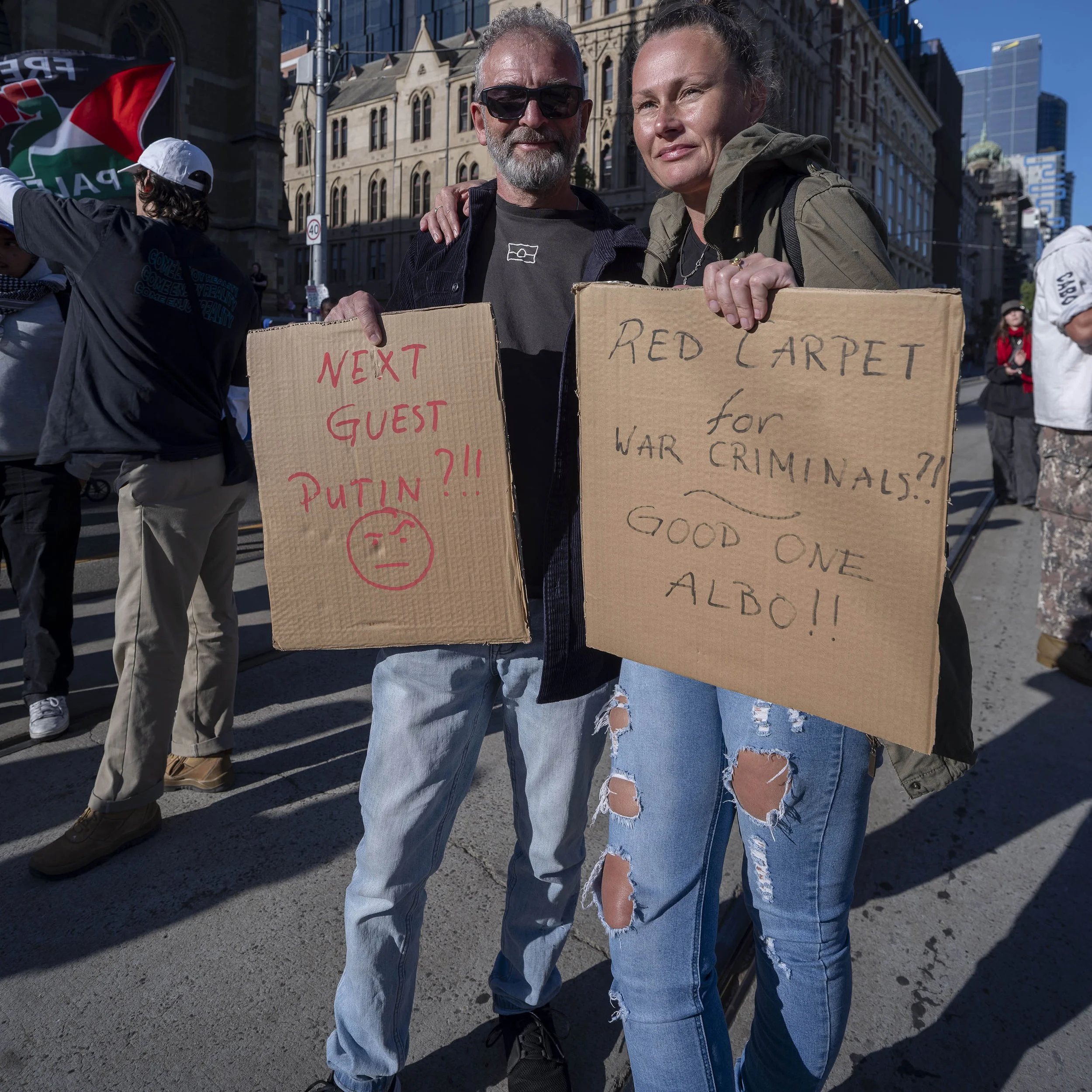 ‘I’m here specifically today because I’m very, very angry that protestors (in Sydney) were brutalised by the police. They were getting arrested for taking a stand against a war criminal. Meanwhile our government, I don't know how much money they’re spending wining and dining a war criminal, someone who is responsible for the deaths of over 70,000 people, it's probably reaching a hundred thousand people by now, and (also) signing a bomb that's getting dropped down onto people.
